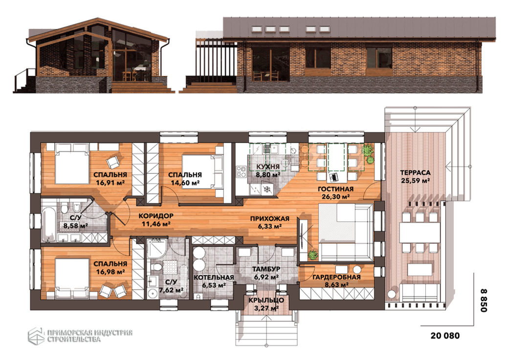 Жилая площадь - 168 м²Размеры (габариты дома) - 20,08 х 8,85м.