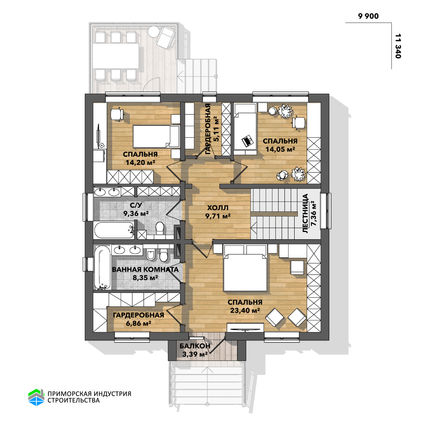 Двухэтажный дом с террасой и балконом, с размерами здания 9,9х14,6 м. Наружная отделка здания – облицовочный кирпич Braer. Фундамент – монолитная ж/б лента. Перегородки – пазогребневые блоки. Пол первого этажа - по монолитной плите. Перекрытие межэтажное - деревянные. Чердачное перекрытие - деревянное. Кровля – металлочерепица. Окна — металлопластиковые.